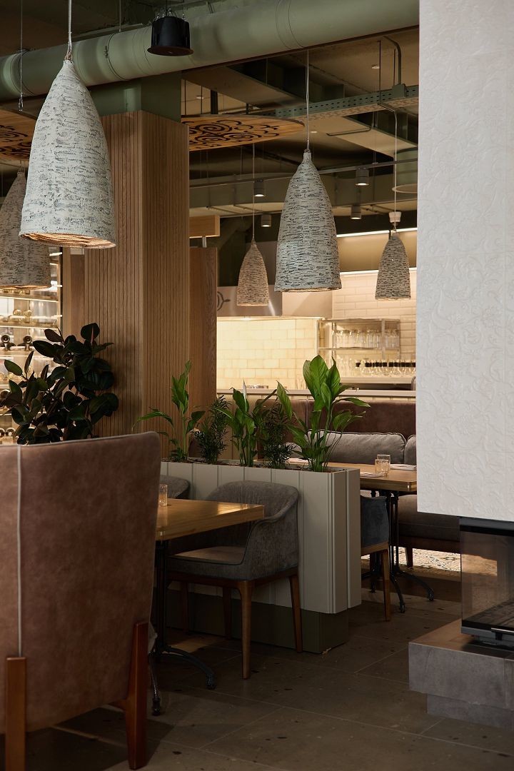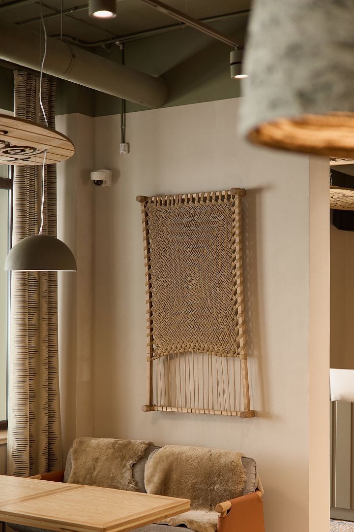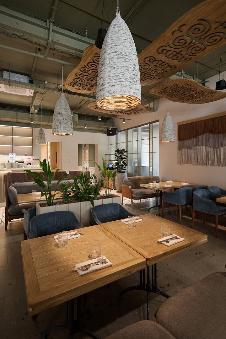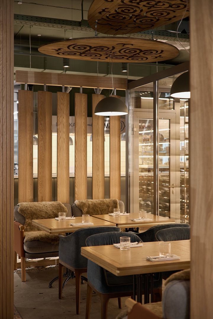 В интерьере ресторана ненавязчиво прослеживаются кавказские мотивы. Например, в макраме на стенах или в специфическом кавказском орнаменте на деревянных панелях под потолком.